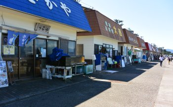 ゲートをくぐってすぐ左側が漁協の直売所です。海鮮料理屋もたくさんあります