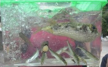 磯ではいろいろな生き物を捕まえました。こちらは珍しいハリセンボンを捕まえた