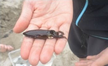 イカが噴き出したイカスミも触ってみました。 目が大きくてカワイイです