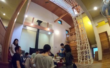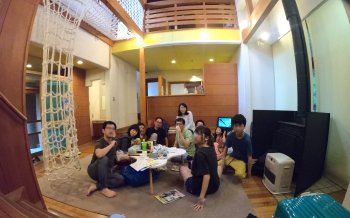 居間でくつろいでます。大人と子どもで12人いても、ゆったり使用できました。居間には、大きなネットの遊具があります