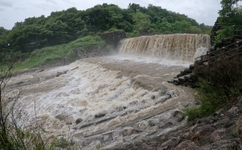 尾白川えん堤は豪雨のため写真のような状態になってました。もちろんウォータースライダーも大きな水流に水没しています